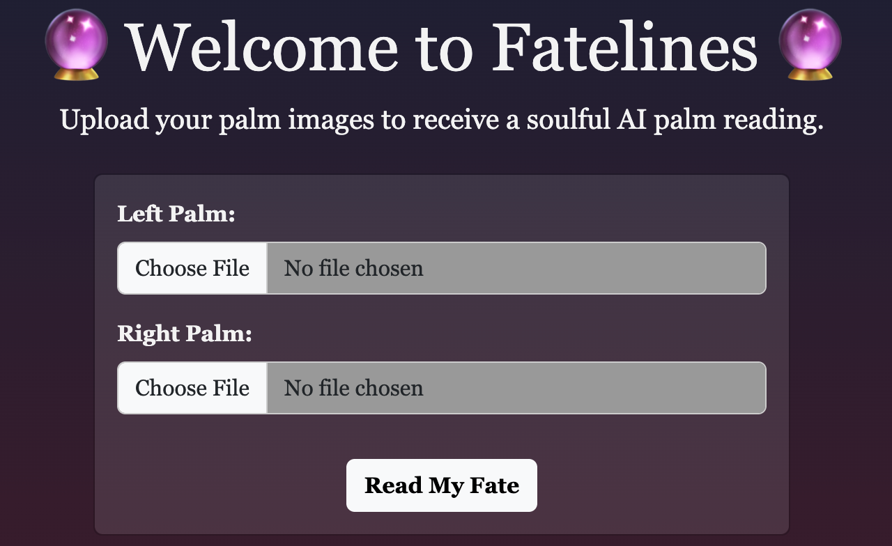Thanks to a (VERY) long flight to India and some weekend hours, I made FateLines – a website that analyzes your palm to give you an AI-generated palm reading. Yes, really.